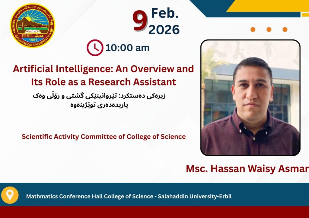 بەرواری ٢٠٢٦/٢/٩ کاتژمێر ١٠:٠٠ی بەیانی بە کاتی (هەولێر) لە (هۆڵی کۆنفرانسی بەشی ماتماتیک لە کۆلێژی زانست)، سيمينارێک لەلایەن لێژنەی چالاکیە زانستیەکان کۆلێژی زانست لەژێر ناونیشانی