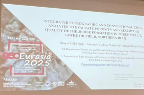 On 14-16th May 2025, Dr. Mahdi Kahiri Aswad, Comprehensive petrographic and traditional core analysis to assess the porosity and quality of the reservoir of the Jeribe formation in three wells, Tawk oil field, Northern Iraq which was held at the Sergo Russian State Geological Exploration University /College of Science. The conference focused on providing a
